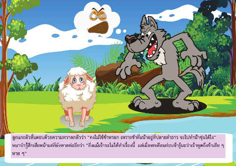 ลูกแกะตัวสั่นตอบด้วยความหวาดกลัวว่า “คงไม่ใช้ข้าหรอก เพราะข้าดื่มน้ำาอยู่ที่ปลายลำาธาร จะไปทำาน้ำาขุ่นได้ไง“ หมาป่ารู้สึกเสียหน้าแต่ก็ยังพาลต่ออีกว่า “ถึงแม้เจ้าจะไม่ได้ทำาเรื่องนี้ แต่เมื่อหกเดือนก่อนข้ารู้นะว่าเจ้าพูดถึงข้าเสีย ๆ หาย ๆ“