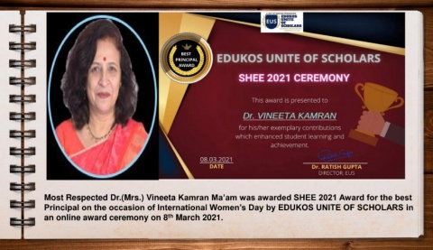 Most Respected Dr.(Mrs.) Vineeta Kamran Ma’am was awarded SHEE 2021 Award for the best Principal on the occasion of International Women’s Day by EDUKOS UNITE OF SCHOLARS in th an online award ceremony on 8 March 2021.