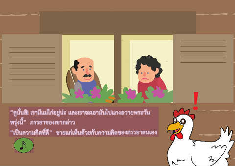 “ดูนั่นสิ! เรามีแม่ไก่อยู่น่ะ และเราจะเอามันไปแกงถวายพระวัน พรุ่งนี้” ภรรยาของเขากล่าว “เป็นความคิดที่ดี” ชายแก่เห็นด้วยกับความคิดของภรรยาตนเอง