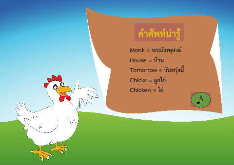 คำาศัพท์น่ารู้ Monk = พระภิกษุสงฆ์ House = บ้าน Tomorrow = วันพรุ่งนี้ Chicks = ลูกไก่ Chicken = ไก่