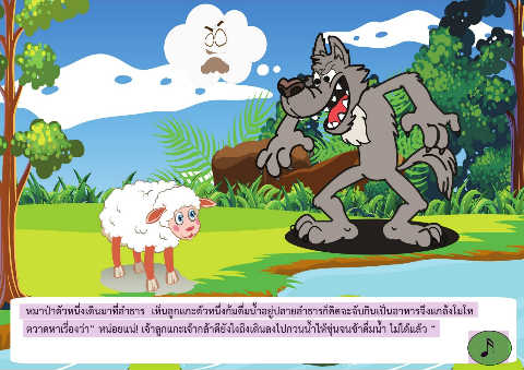 ้ ำ หมาป่าตัวหนึ่งเดินมาที่ลำาธาร เห็นลูกแกะตัวหนึ่งก้มดื่มนาอยู่ปลายลำาธารก็คิดจะจับกินเป็นอาหารจึงแกล้งโมโห ้ ้ ำ ตวาดหาเรื่องว่า“ หน่อยแน่! เจ้าลูกแกะเจ้ากล้าดียังไงถึงเดินลงไปกวนนาให้ขุ่นจนข้าดื่มนา ไม่ได้แล้ว “ ำ