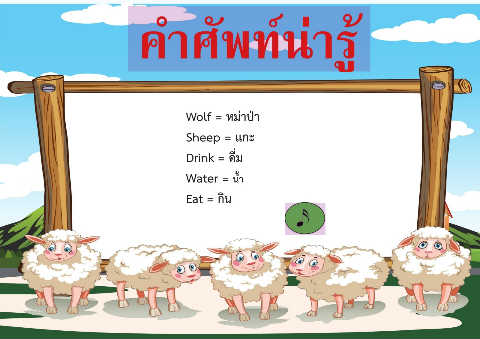 Wolf = หม่าป่า Sheep = เเกะ Drink = ดื่ม ้ ำ Water = นา Eat = กิน