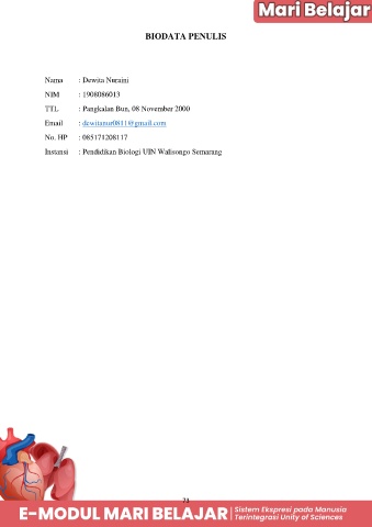 BIODATA PENULIS Nama : Dewita Nuraini NIM : 1908086013 TTL : Pangkalan Bun, 08 November 2000 Email : dewitanur0811@gmail.com No. HP : 085171208117 Instansi : Pendidikan Biologi UIN Walisongo Semarang 73