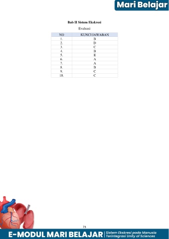 Bab II Sistem Ekskresi Evaluasi NO KUNCI JAWABAN 1. B 2. D 3. C 4. B 5. E 6. A 7. A 8. B 9. C 10. C 73