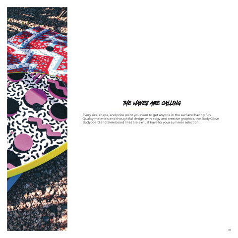 Every size, shape, and price point you need to get anyone in the surf and having fun. Quality materials and thoughtful design with edgy and creative graphics, the Body Glove Bodyboard and Skimboard lines are a must have for your summer selection.