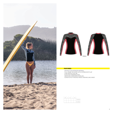 FEATURES: PNKBLK • MAGNA-FLEX EXTERIOR MATERIAL • FULL FRONT ZIP ENTRY WITH INTERIOR ZIP FLAP • LOW PROFILE COLLAR • FLATLOCK CONSTRUCTION • SEAMLESS UNDERARM PANELING • COVER STITCH FINISHED WAIST OPENING AND WRIST PNKBLK BLUBLK 9 XS S M L XL