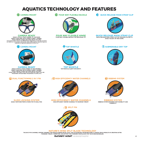 THE SPLIT-FIN CHANNELS WATER TOWARDS THE MIDDLE DURING INITIAL KICK, THE ACCELERATED WATER BECOMES A VORTEX WHICH RESULTS IN CREATING EXTRA FORWARD THRUST, THEREFORE LESS EFFORT FOR FORWARD PROPULSION FOR THE DIVER/SNORKELER.