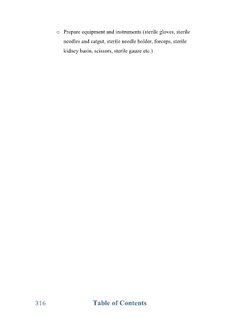 o Prepare equipment and instruments (sterile gloves, sterile needles and catgut, sterile needle holder, forceps, sterile kidney basin, scissors, sterile gauze etc.) 316 Table of Contents