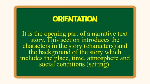 ORIENTATION It is the opening part of a narrative text story. This section introduces the characters in the story (characters) and the background of the story which includes the place, time, atmosphere and social conditions (setting).