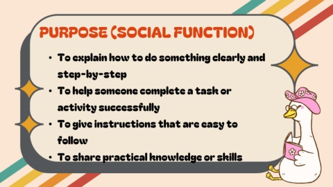 PURPOSE (SOCIAL FUNCTION) • To explain how to do something clearly and step-by-step • To help someone complete a task or activity successfully • To give instructions that are easy to follow • To share practical knowledge or skills