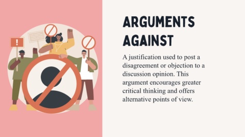 Arguments Against A justification used to post a disagreement or objection to a discussion opinion. This argument encourages greater critical thinking and offers alternative points of view.