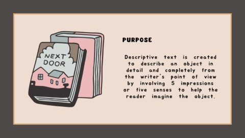 PURPOSE Descriptive text is created to describe an object in detail and completely from the writer's point of view by involving 5 impressions or five senses to help the reader imagine the object.