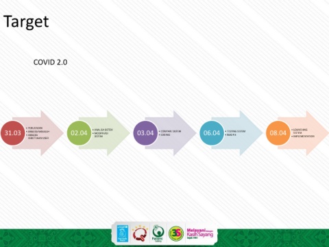 Target COVID 2.0 • PENUGASAN • ANALISA SISTEM • LOUNCHING 31.03 • ANALISA MASALAH 02.04 • MODIFIKASI 03.04 • COMPARE SISTEM 06.04 • TESTING SISTEM 08.04 SISTEM • CODING • BUG FIX • ANALISA KEBUTUHAN USER SISTEM • IMPLEMENTATION