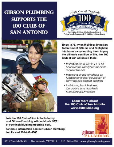 Join the 100 Club of San Antonio today and Gibson Plumbing will contribute 50% of your individual membership cost.