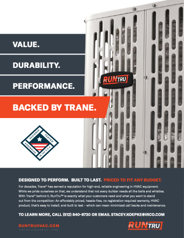 For decades, Trane® has earned a reputation for high-end, reliable engineering in HVAC equipment. While we pride ourselves on that, we understand that not every builder needs all the bells and whistles. With Trane® behind it, RunTruTM is exactly what your customers need and what you want to stand