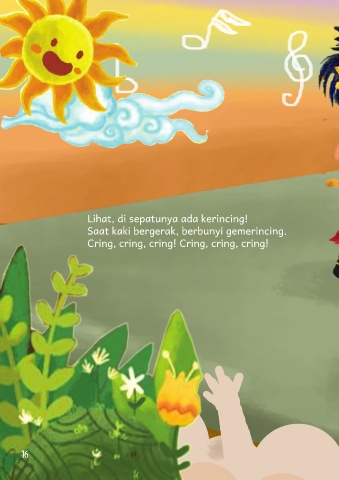 Lihat, di sepatunya ada kerincing! Saat kaki bergerak, berbunyi gemerincing. Cring, cring, cring! Cring, cring, cring! 14 16 16