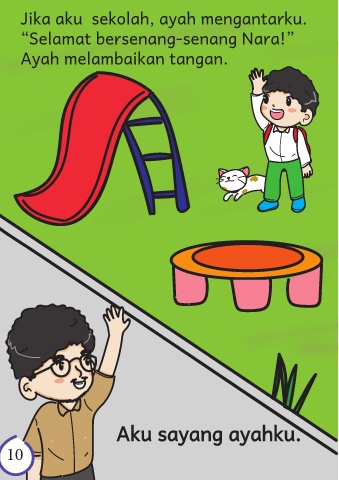 Jika aku sekolah, ayah mengantarku. Jika aku ikut lomba, tapi aku kalah. “Selamat bersenang-senang Nara!” Ayah selalu memberi semangat Ayah melambaikan tangan. “Nara hebat! Nara sudah berani!” Aku sayang ayahku. Aku sayang ayahku. 10 10 9