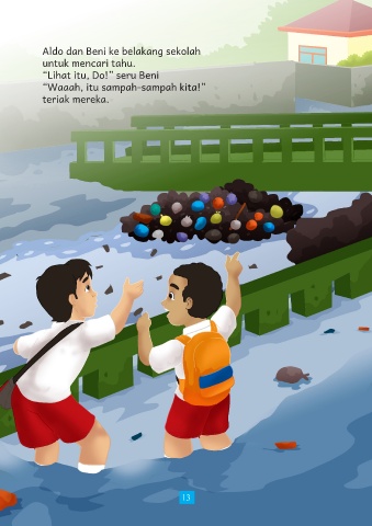 Aldo dan Beni ke belakang sekolah untuk mencari tahu. “Lihat itu, Do!” seru Beni “Waaah, itu sampah-sampah kita!” teriak mereka. 13