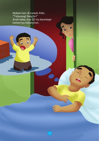 Malam hari di rumah Aldo. “Tolooong! Banjiiir!” Anak kelas dua SD itu bermimpi kamarnya kebanjiran. 15