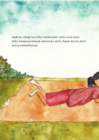 11 12 Sejak itu, setiap hari Atika membacakan cerita untuk Santi. Atika mempunyai banyak sekali buku cerita. Bapak dan ibu Santi sering membelikannya. 12 11 11 12