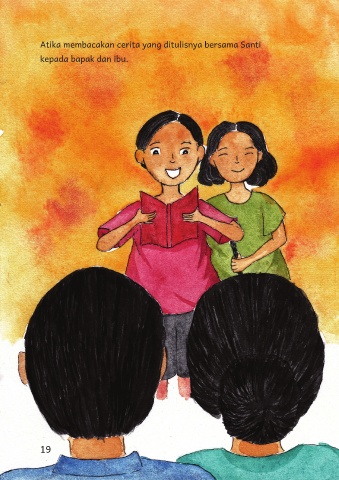 Atika membacakan cerita yang ditulisnya bersama Santi