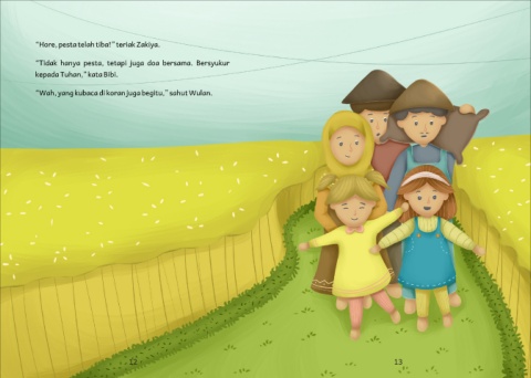 “Hore, pesta telah tiba!” teriak Zakiya. “Tidak hanya pesta, tetapi juga doa bersama. Bersyukur kepada Tuhan,” kata Bibi. “Wah, yang kubaca di koran juga begitu,” sahut Wulan. 12 13