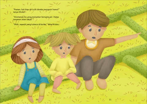“Paman, kok bisa sih kulit domba mengusir hama?” tanya Wulan. “Aromanya itu yang menyebar bersama air. Hama tanaman akan takut.” “Wah, seperti yang kubaca di koran,” kata Wulan. 20 21