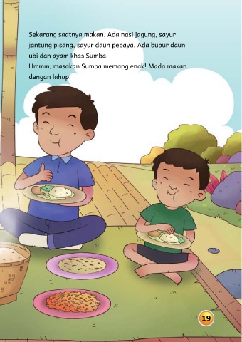 Sekarang saatnya makan. Ada nasi jagung, sayur jantung pisang, sayur daun pepaya. Ada bubur daun ubi dan ayam khas Sumba. Hmmm, masakan Sumba memang enak! Mada makan dengan lahap. 18 19