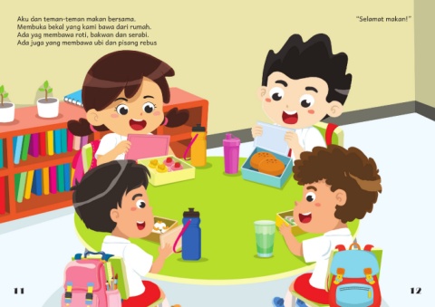 Aku dan teman-teman makan bersama. “Selamat makan!” Membuka bekal yang kami bawa dari rumah. Ada yag membawa roti, bakwan dan serabi. Ada juga yang membawa ubi dan pisang rebus 11 12