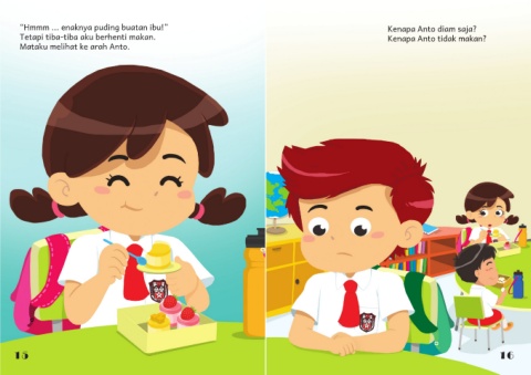 “Hmmm ... enaknya puding buatan ibu!” Kenapa Anto diam saja? Tetapi tiba-tiba aku berhenti makan. Kenapa Anto tidak makan? Mataku melihat ke arah Anto. 15 16