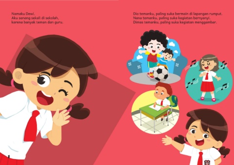 Namaku Dewi. Dio temanku, paling suka bermain di lapangan rumput. Aku senang sekali di sekolah, Nana temanku, paling suka kegiatan bernyanyi. karena banyak teman dan guru. Dimas temanku, paling suka kegiatan menggambar. 1 2