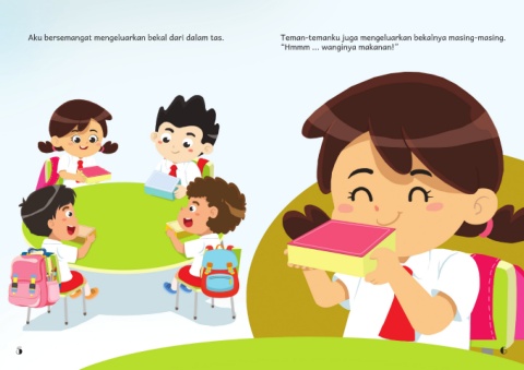 Aku bersemangat mengeluarkan bekal dari dalam tas. Teman-temanku juga mengeluarkan bekalnya masing-masing. “Hmmm ... wanginya makanan!” 5 6