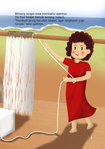 Bittoeng sangat suka membantu ayahnya. Dia bisa belajar banyak tentang melaut. “Membuat jaring haruslah telaten, agar tangkapan juga banyak,” kata ayahnya. 5