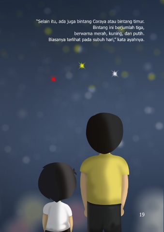 “Selain itu, ada juga bintang Coraya atau bintang timur. Bintang ini berjumlah tiga, berwarna merah, kuning, dan putih. Biasanya terlihat pada subuh hari,” kata ayahnya. 19