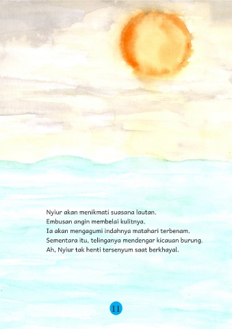 Nyiur akan menikmati suasana lautan. Embusan angin membelai kulitnya. Ia akan mengagumi indahnya matahari terbenam. Sementara itu, telinganya mendengar kicauan burung. Ah, Nyiur tak henti tersenyum saat berkhayal. 11