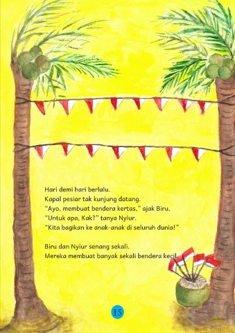 “Ayo, membuat bendera kertas,” ajak Biru.