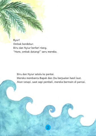 Byur! Ombak berdebur. Biru dan Nyiur berlari riang. “Hore, ombak datang!” seru mereka. Biru dan Nyiur selalu ke pantai. Mereka membantu Bapak dan Ibu berjualan hasil laut. Akan tetapi, saat sepi pembeli, mereka bermain di pantai. 2