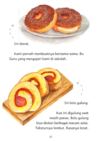 Ini donat. Kami pernah membuatnya bersama-sama. Bu Guru yang mengajari kami di sekolah. Ini bolu gulung. Kue ini digulung saat masih panas. Bolu gulung bisa diolesi berbagai macam selai. Teksturnya lembut. Rasanya lezat. 15