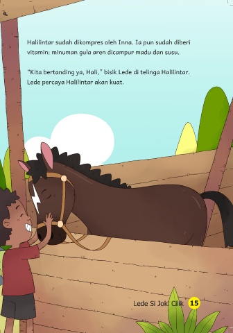 Halilintar sudah dikompres oleh Inna. Ia pun sudah diberi vitamin: minuman gula aren dicampur madu dan susu. “Kita bertanding ya, Hali,” bisik Lede di telinga Halilintar. Lede percaya Halilintar akan kuat. Lede Si Joki Cilik 15