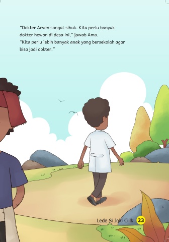 “Dokter Arven sangat sibuk. Kita perlu banyak dokter hewan di desa ini,” jawab Ama. “Kita perlu lebih banyak anak yang bersekolah agar bisa jadi dokter.” Lede Si Joki Cilik 23