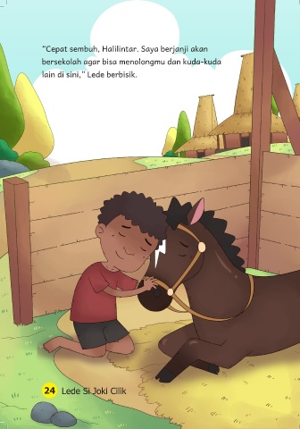 “Cepat sembuh, Halilintar. Saya berjanji akan bersekolah agar bisa menolongmu dan kuda-kuda lain di sini,” Lede berbisik. 24 Lede Si Joki Cilik