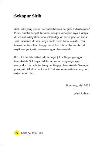 Buku ini berisi cerita Lede sebagai joki cilik yang enggan