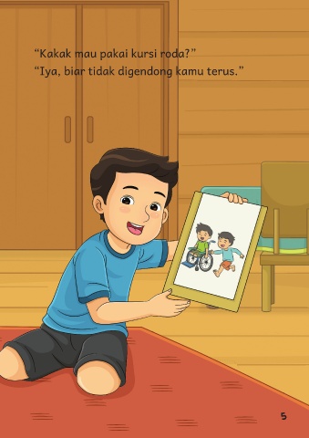 “Kakak mau pakai kursi roda?” “Iya, biar tidak digendong kamu terus.” 5