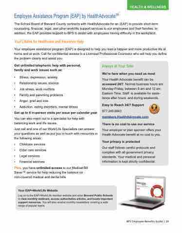 The School Board of Brevard County contracts with HealthAdvocate for an (EAP) to provide short-term counseling, financial, legal, and other work/life support services to our employees and their families. In addition, the EAP provides support to BPS to assist with employees having difficulty in the workplace.