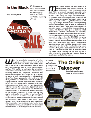 Black Friday of course, it was simply associated with the crash of the gold market on September 24, 1869. By 1961 “Black Friday had caught on in Philadelphia, to the extent that the cities merchants unsuccessfully tried to change the name to “Big Friday” but the name didn’t really catch on till the early 2000’s. But instead of it being a good thing in the 60’s it was a bad thing meaning the Gold Market Crash back in 1869. In 1985 retailers wanted to make “Black Friday” a good thing instead of bad so they made it the kickoff of the Christmas Shopping season. This transition from good to bad was called “Red to Black”. The term Cyber Monday was created by marketing companies to persuade people to shop online. The term was coined by Ellen Davis and Scott Silverman, and made its debut on November 28, 2005 in a shop.org press release. Cyber Monday was created to give online stores a chance against Brick-and-Mortar stores that get a ton of customers on Black Friday. Cyber Monday wasn’t as popular back in 2005 and was the 12th most popular shopping day of the year but has only grown since then. Many online retailers saw an expected rise in sales as Cyber Monday grew, likely as a result of these free market efforts. Cyber Monday has since pushed up sales in the online community and increased shopping rates throughout the holiday season.