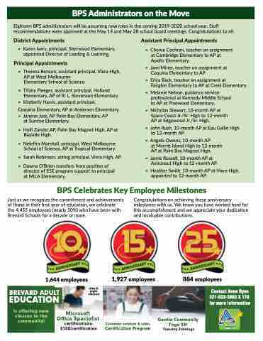 Eighteen BPS administrators will be assuming new roles in the coming 2019-2020 school year. Staff recommendations were approved at the May 14 and May 28 school board meetings. Congratulations to all: