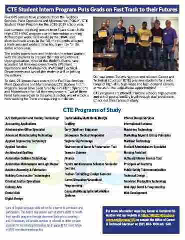 For more information regarding Career & Technical Ed- ucation visit our website at https://fl02201431.school- wires.net/Domain/1173 or contact the Office of Career & Technical Education at: (321) 633- 1000 ext. 380.