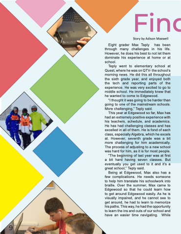 Being at Edgewood, Max also has a few complications. He needs someone to help him translate his schoolwork into braille. Over the summer, Max came to Edgewood so that he could learn how to get around Edgewood easily. As he is visually impaired, and he cannot see to get around, he had to learn to memorize his paths. This way, he had the opportunity to learn the ins and outs of our school and have an easier time navigating. While