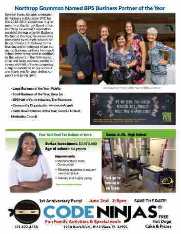 Brevard Public Schools celebrated its Partners in Education (PIE) for the 2018-2019 school year in a ce- remony at the School Board office. Northrop Grumman Corporation received the top prize for Business Partner of the Year. Grumman was nominated by multiple schools for its countless contributions to the learning and enrichment of our stu- dents. Business partners from each school were recognized in addition to the winner’s in the faith-based, small and large business, rookie bu- siness and Hall of Fame categories. Congratulations to all our winners and thank you for your tireless su- pport and giving spirit: