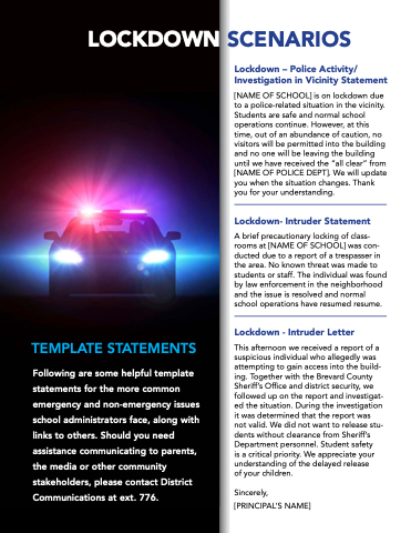 Following are some helpful template statements for the more common emergency and non-emergency issues school administrators face, along with links to others. Should you need assistance communicating to parents, the media or other community stakeholders, please contact District Communications at ext. 776.